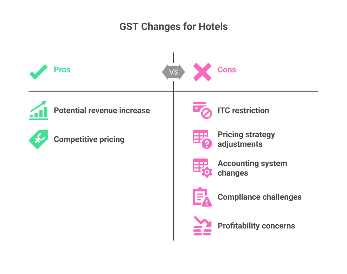 The proposed changes to the GST rate for hotel accommodation services, while seemingly beneficial, come with the significant condition of restricting Input Tax Credit. Hotels must carefully analyse the implications of these changes on their pricing strategies, accounting systems, and overall profitability. Compliance with the CGST Act, 2017, regarding the reversal of ITC is crucial to avoid penalties. The hotel industry needs to adapt to these changes to remain competitive and sustainable in the evolving GST landscape.